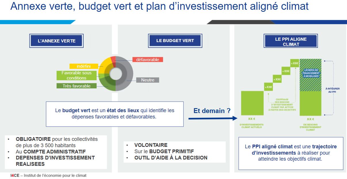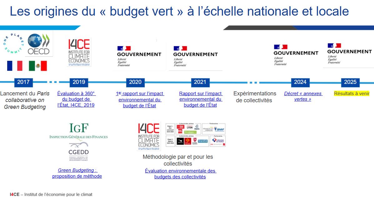 Cette obligation s’appuie sur plusieurs années d’expérimentations autour du budget vert, initiée par l’État et déclinées par des collectivités volontaires. En 2017, lors du One Planet Summit, conjointement avec l’OCDE, la France lance une initiative de collaboration inter-étatique sur le green budgeting, dans le cadre de l’alignement des flux financiers avec l’Accord de Paris. En 2019, I4CE réalise la première revue indépendante du budget de l’État français afin d’identifier l’impact favorable ou défavorable à la lutte contre le changement climatique. En parallèle, le gouvernement missionne l’IGF (Inspection générale des finances) et le CGEDD (Conseil général à l’environnement et au développement durable) pour proposer une méthode de green budgeting. Grâce à cette méthode, l’État réalise lui-même son budget vert depuis 2020 afin d’informer parlementaires et citoyens de l’impact environnemental de chaque programme budgétaire. Cet outil doit servir à la fois dans les débats budgétaires mais aussi à la construction du budget afin d’en faire un outil utile, même si dans la pratique son utilisation reste très largement imparfaite