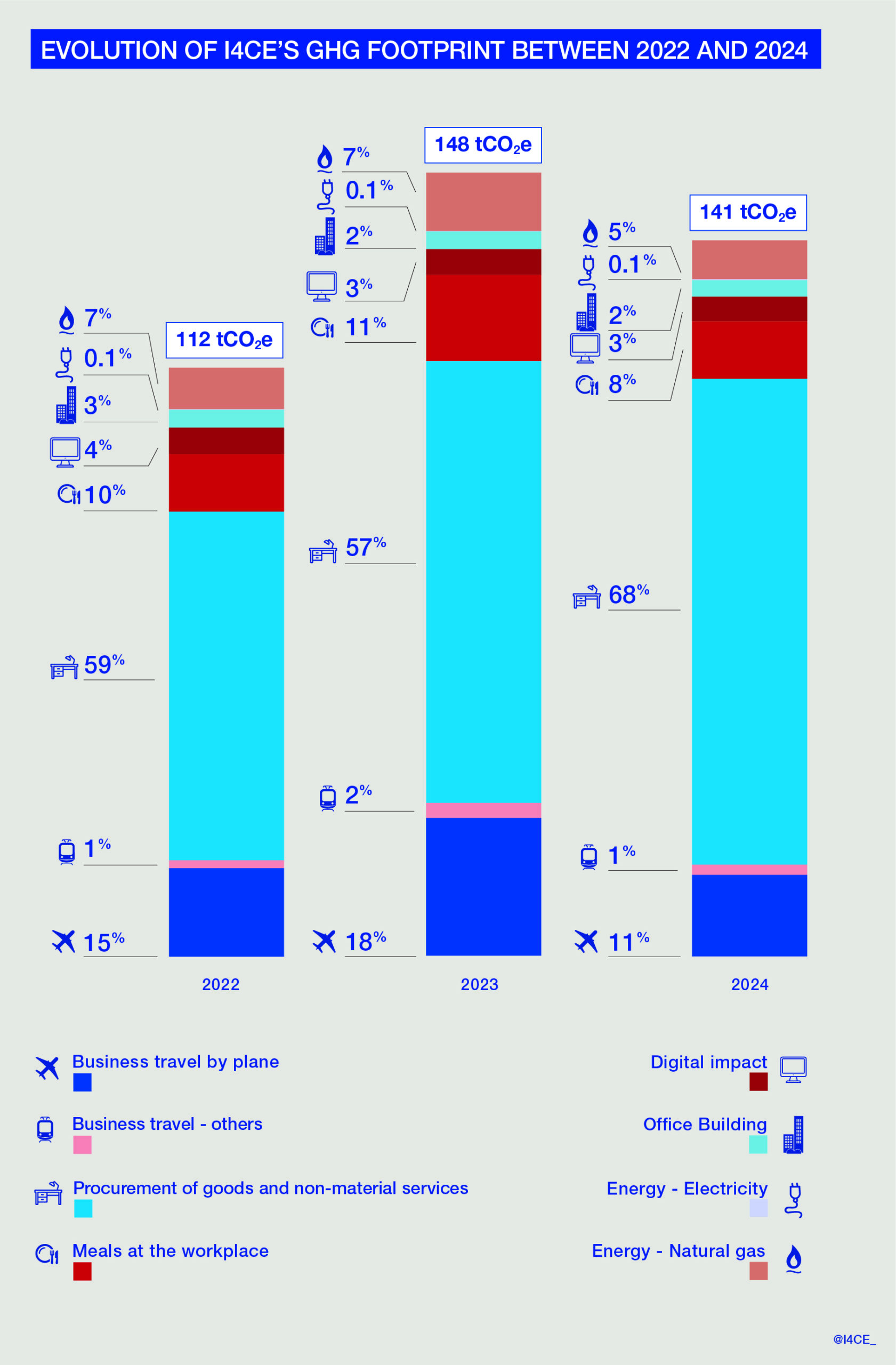 On the other hand, an increase of more than 11 tCO2e of emissions from the procurement of goods and services (including for example accommodation during business trips and work with external contractors), due to the increase in FTEs and inflation, explains why the overall decrease in I4CE’s emissions does not reflect the level of decrease in emissions from business travel.