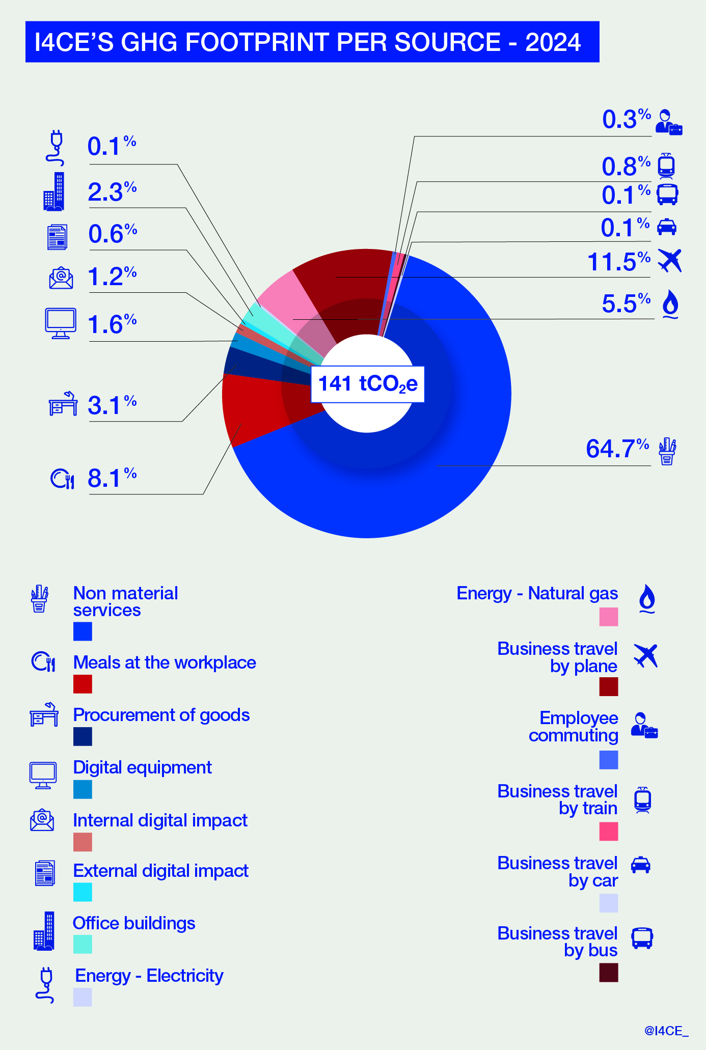 I4CE intends to reduce the impact of its business travel by favouring online meetings and participation to events but also by incentivising train over air travel whenever an alternative exists. Air travel in I4CE’s footprint decreased to 13% in 2024 compared to 17.6% in 2023. The team working at the international level at I4CE has in fact less participated in international events compared to the previous year. Business travel by car, as well as employee commuting continue to represent minor emissions, respectively 0.1% and 0.3%.