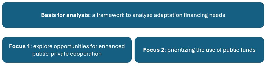 • Basis for analysis: develop and discuss an operational framework for summarizing the specific financing challenges for each category of adaptation needs. The goal is to identify criteria for understanding where the resources needed for adaptation can be mobilized and which public policy tools should be prioritized for this purpose.