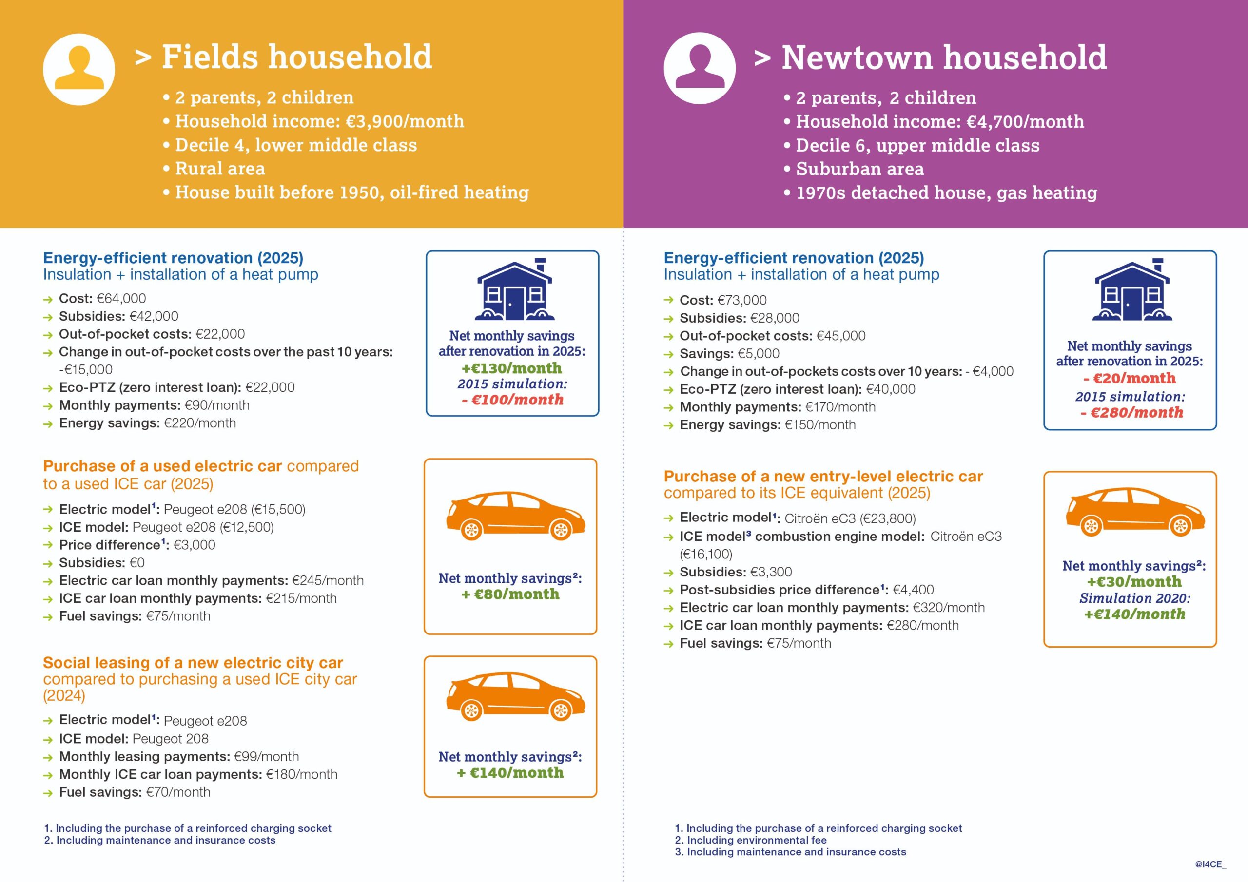 This edition of the Observatory reviews key indicators, that enable us to assess the capacity of households to invest in the ecological transition, for both housing and mobility. These indicators are assessed retrospectively for two middle-income household profiles: a lower- middle-income rural household (the Fields family) and an upper-middle-income periurban household (the Newtown family).