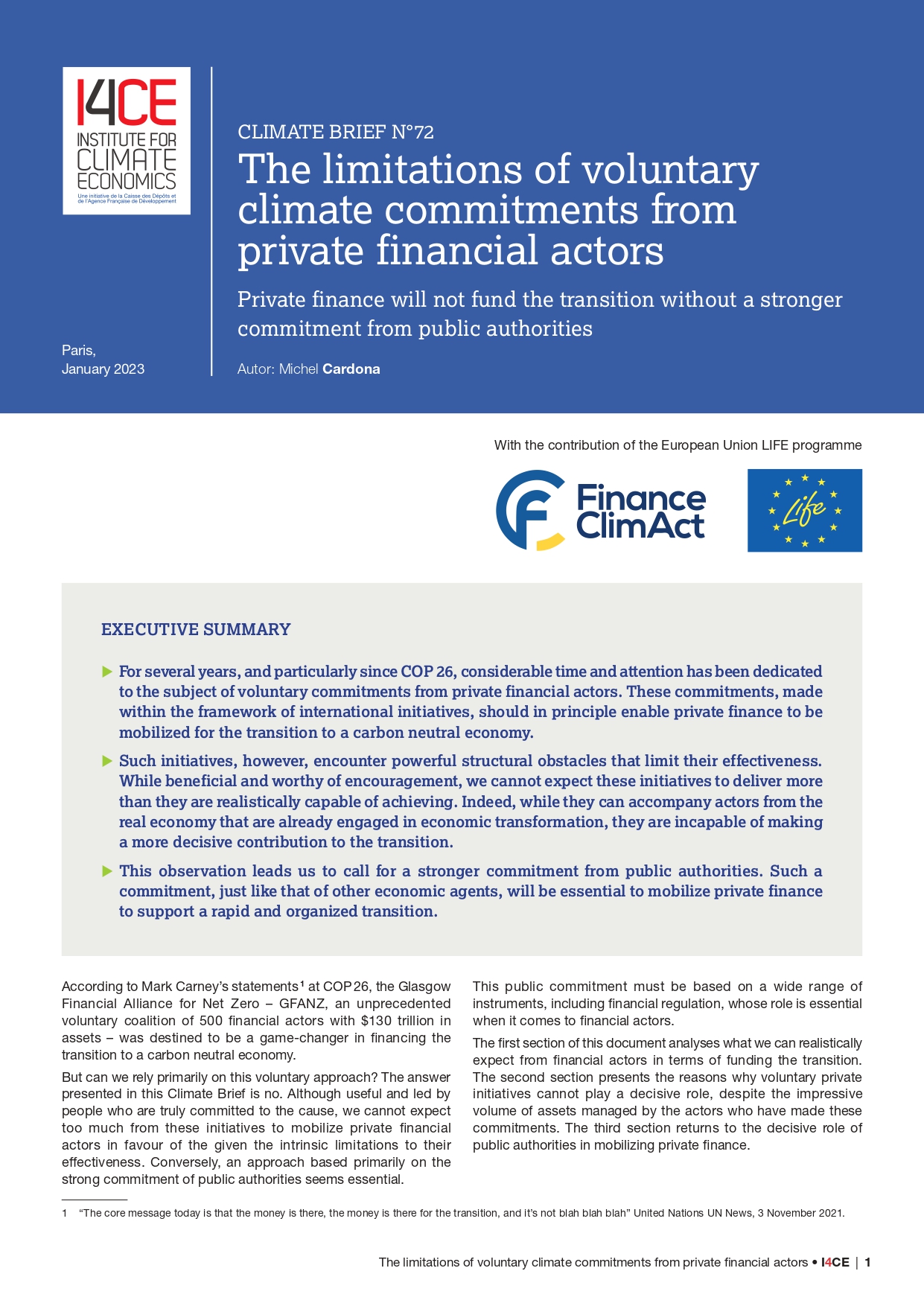 The first section of this document analyses what we can realistically expect from financial actors in terms of funding the transition. The second section presents the reasons why voluntary private initiatives cannot play a decisive role, despite the impressive volume of assets managed by the actors who have made these commitments. The third section returns to the decisive role of public authorities in mobilizing private finance.