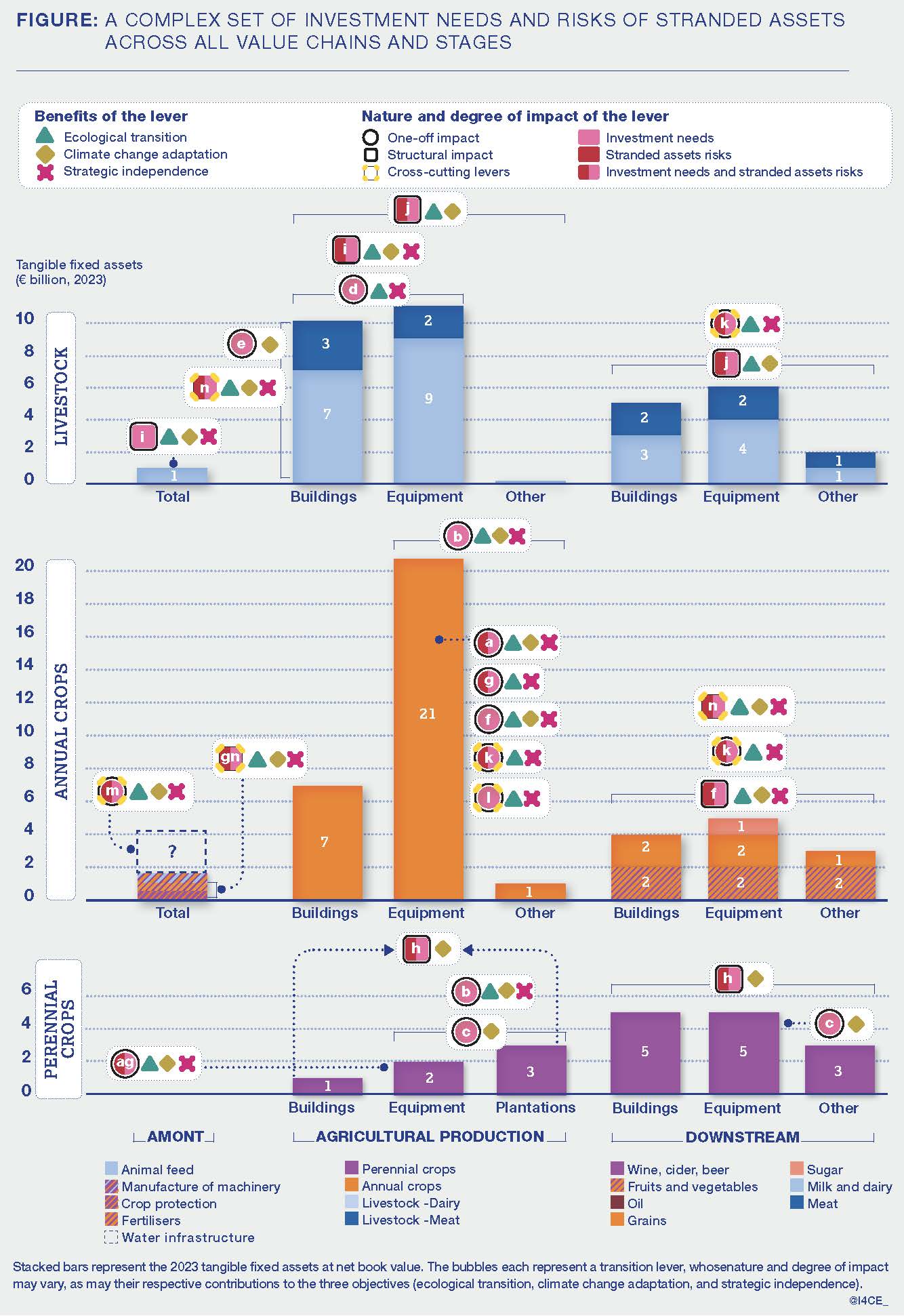 The transition also entails more structural investment needs, affecting the configuration of buildings and perennial plantations and potentially generating stranded assets. The agricultural and food production assets affected by these more structural needs amount to approximately €70 billion. These include: