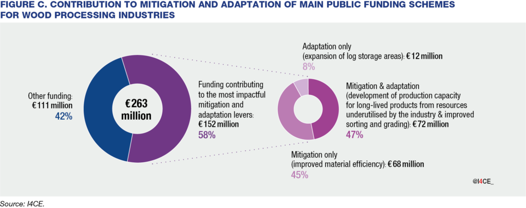 Using an analytical framework to assess how investments contribute to mitigation and adaptation in wood industries, we estimate that €152 million contributes to climate objectives, through industrial modernisation and process optimisation, as well as, to a lesser extent, through the development of processing capacity for hardwood and low-grade or small-diameter wood (Figure C). The remaining funding mainly supports the expansion of softwood processing capacity.