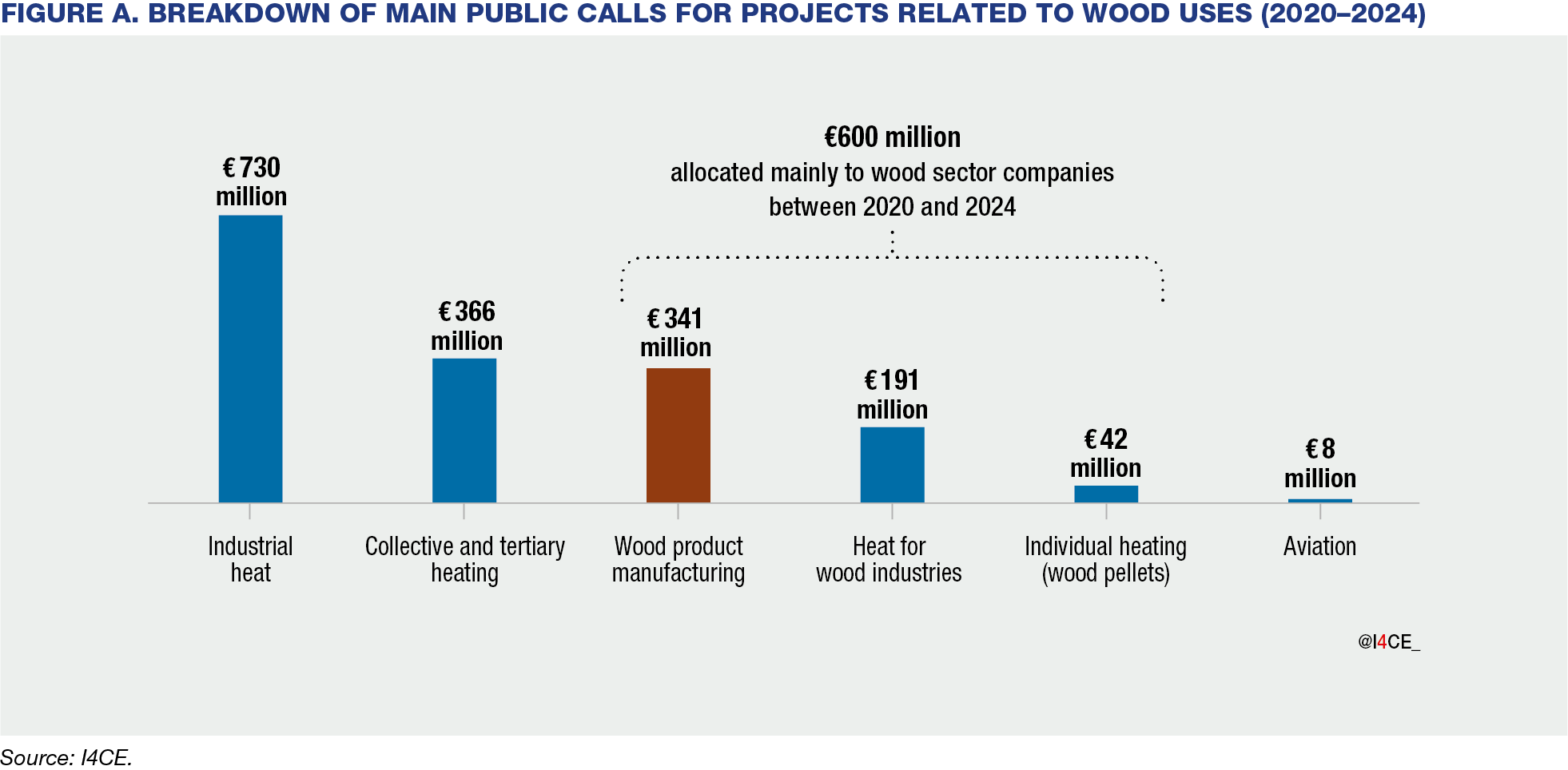 Since 2020, the wood sector has benefited from unprecedented public funding: €1.7 billion in public funding related to wood uses and allocated through calls for projects was identified over the period 2020–2024. While slightly more than €1.1 billion was mobilised for energy production outside the wood sector, nearly €600 million directly supported wood industry companies, including around €340 million for wood processing, mainly in construction (Figure A).