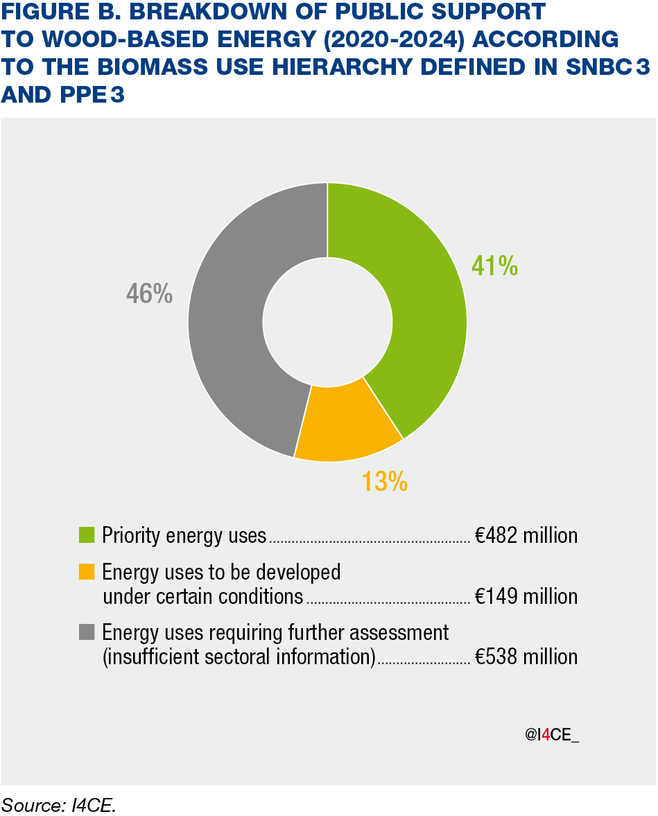 Overall, this hierarchy appears to be broadly respected. Around 41% of funding can be linked to priority energy uses with no viable alternatives to biomass, such as high-temperature industrial heat and internal energy consumption within the forest-based sector. By contrast, only 13% of funding supports uses that should be developed more cautiously and under certain conditions, such as low-temperature industrial heat and sustainable aviation fuels (Figure B). No funding is explicitly directed towards uses considered to be limited. However, this assessment remains partial. Nearly half of the funding (46%) cannot be clearly positioned within the hierarchy, due to insufficiently detailed information on some industrial heat and collective heating projects. This points to the importance of sufficiently detailed expenditure tracking to better characterise supported uses, assess their alignment with SNBC and PPE priorities, and inform future funding decisions.
