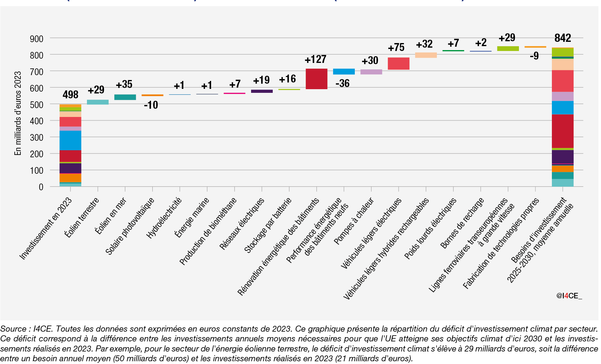 Avec un besoin estimé à 813 milliards d’euros par an pour atteindre les objectifs climatiques de 2030, le niveau d’investissement observé en 2022 laisse apparaître un déficit d’investissement climatique de 407 milliards d’euros – soit 2,6 % du PIB de l’UE. En d’autres termes, l’économie européenne doit doubler son niveau d’investissement climatique pour être en mesure d’atteindre les objectifs 2030 de l’Union.