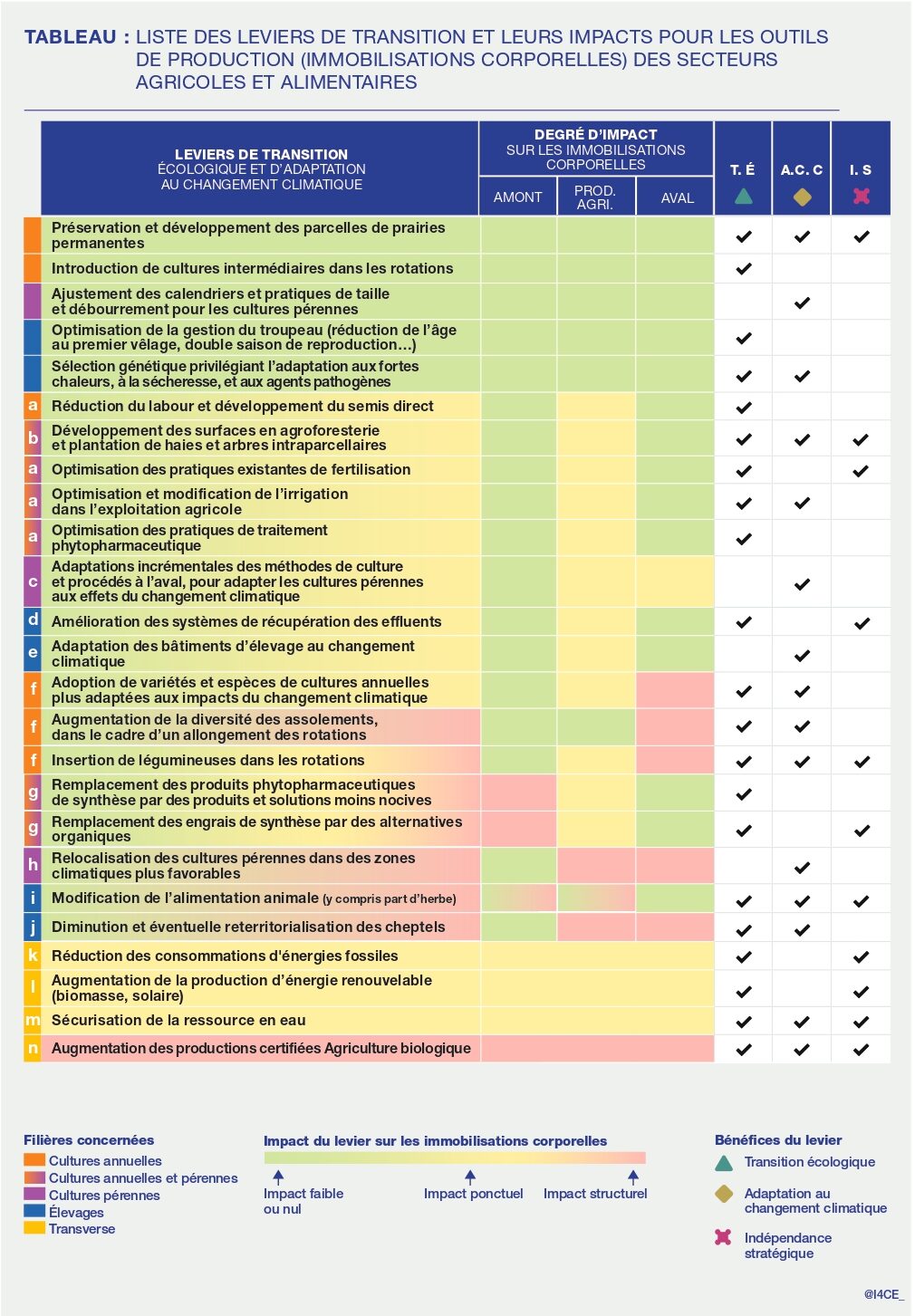 Une coordination et une planification des investissements peuvent limiter les coûts de la transition. En effet, la transition implique de faire évoluer simultanément plusieurs filières, maillons et territoires (Tableau X). Un même outil de production peut être concerné par plusieurs leviers de transition, certains appelant à y investir pour l’optimiser ou l’améliorer, et d’autres à le remplacer (Figure X). Des choix d’investissements coordonnés et planifiés pourraient limiter le coût global de la transition en anticipant les besoins et donc les éventuelles pertes de capital.