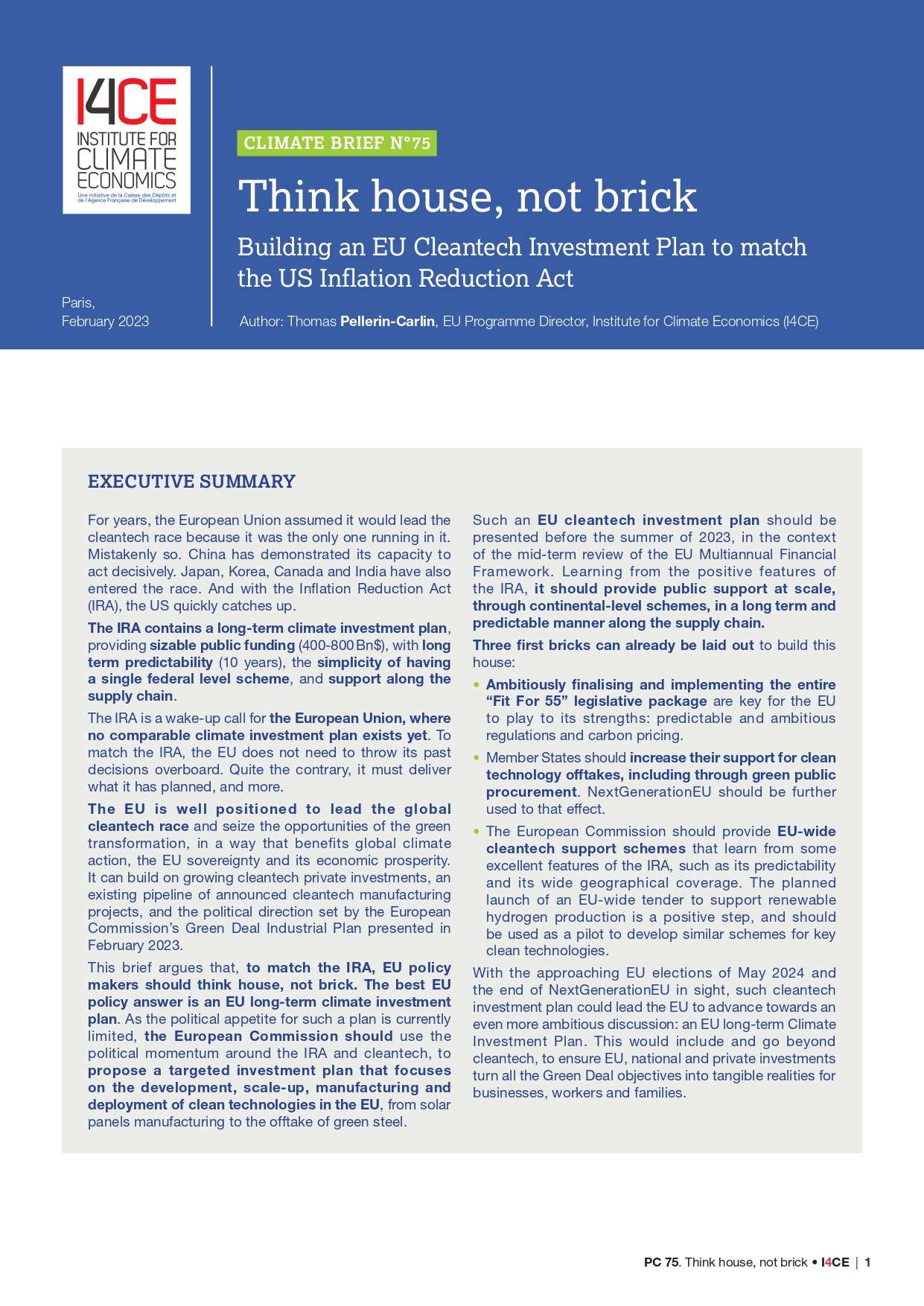 Cette note soutient que, pour répondre à l’IRA, les décideurs politiques européens doivent penser à construire la maison, et non seulement débattre d’une brique. La meilleure réponse politique de l’UE est un plan d’investissement climatique à long terme. Comme l’appétit politique pour un tel plan est actuellement limité, la Commission européenne devrait profiter de l’élan politique autour de l’IRA et des technologies propres, pour proposer un plan d’investissement ciblé qui se concentre sur le développement, le passage à l’échelle, la fabrication et le déploiement des technologies propres dans l’UE, de la fabrication de panneaux solaires à celle de l’acier vert.