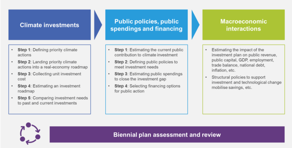 - La définition des politiques et dépenses publiques pour répondre aux besoins d’investissement climat, ainsi que leur financement.